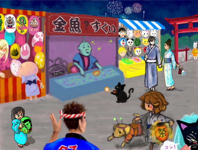流れるように空、地面、屋台、鳥居と出来上がっていくんですよ!